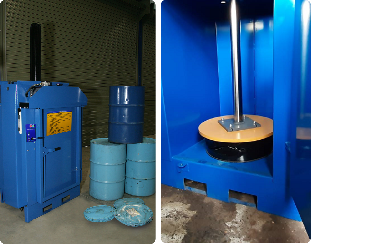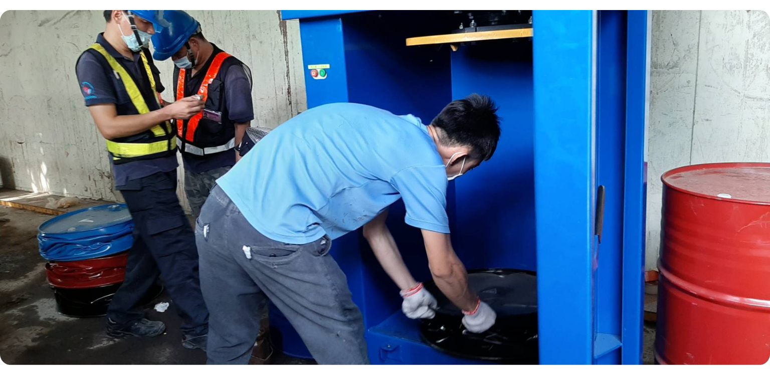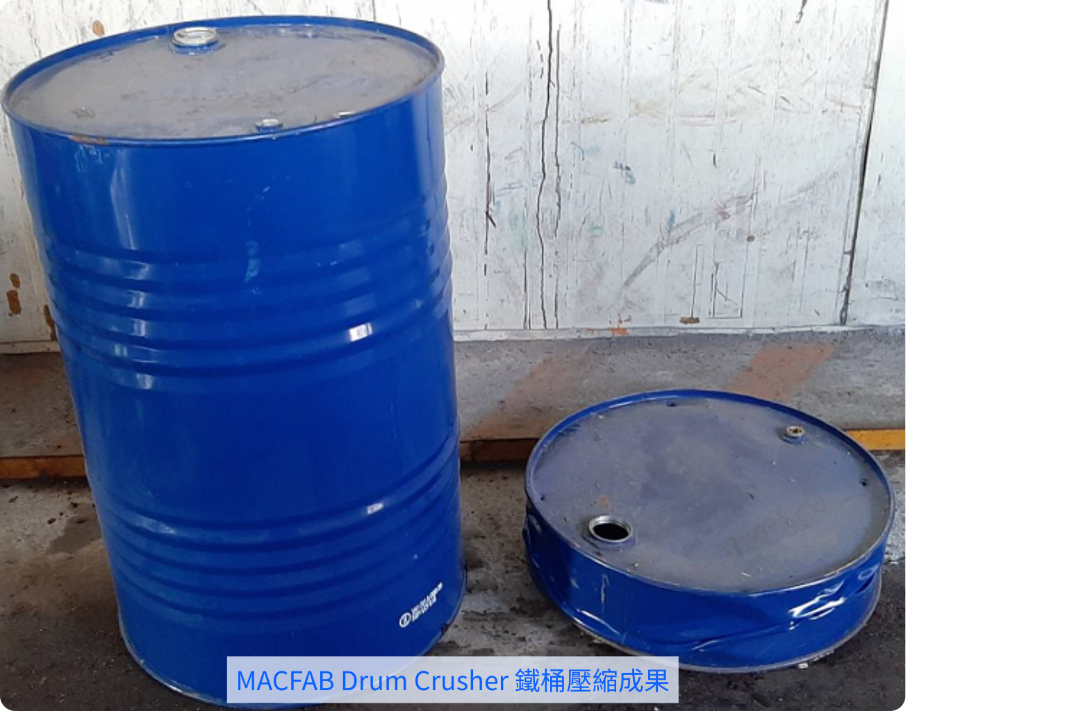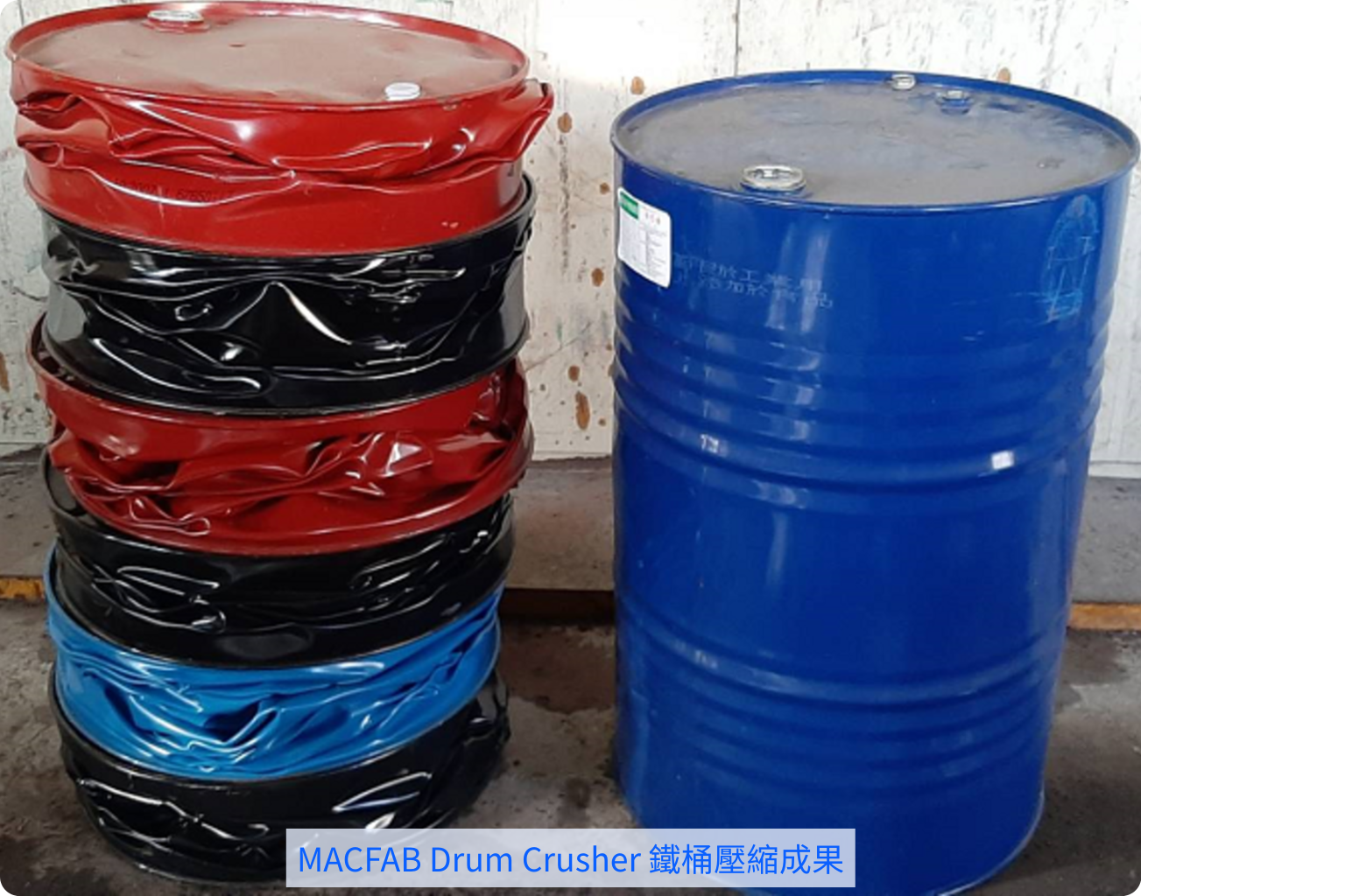 圓筒形狀的金屬桶雖然是用來填液體的最佳容器,可是一旦內容物使用殆盡後,這些容器反而成為儲存擺放的噩夢,不僅需要大範圍的空間又擔心擺太高而傾倒的工安問題。現在,我們有專門將金屬桶減容的壓縮打包機MACFAB Drum Crusher,他有著強大的壓縮減容能力,以一般的金屬桶而言最少有6:1的壓縮效果(視材質而定),對使用者可以大大的降低儲存空間,對回收業者可藉由減少載運的趟次來降低運輸成本,可說是創造雙贏的回收模式。